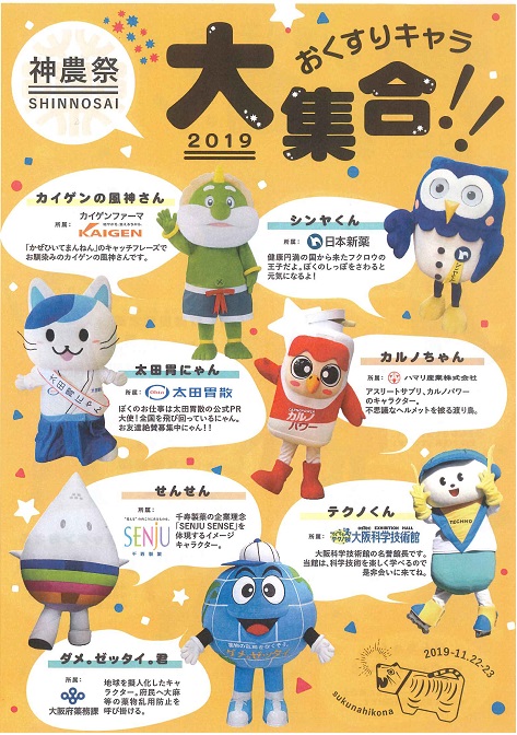 少彦名神社のゆるキャラ「神農さん」やかんちゃんを始め、薬のゆるキャラ達が大集合するので、