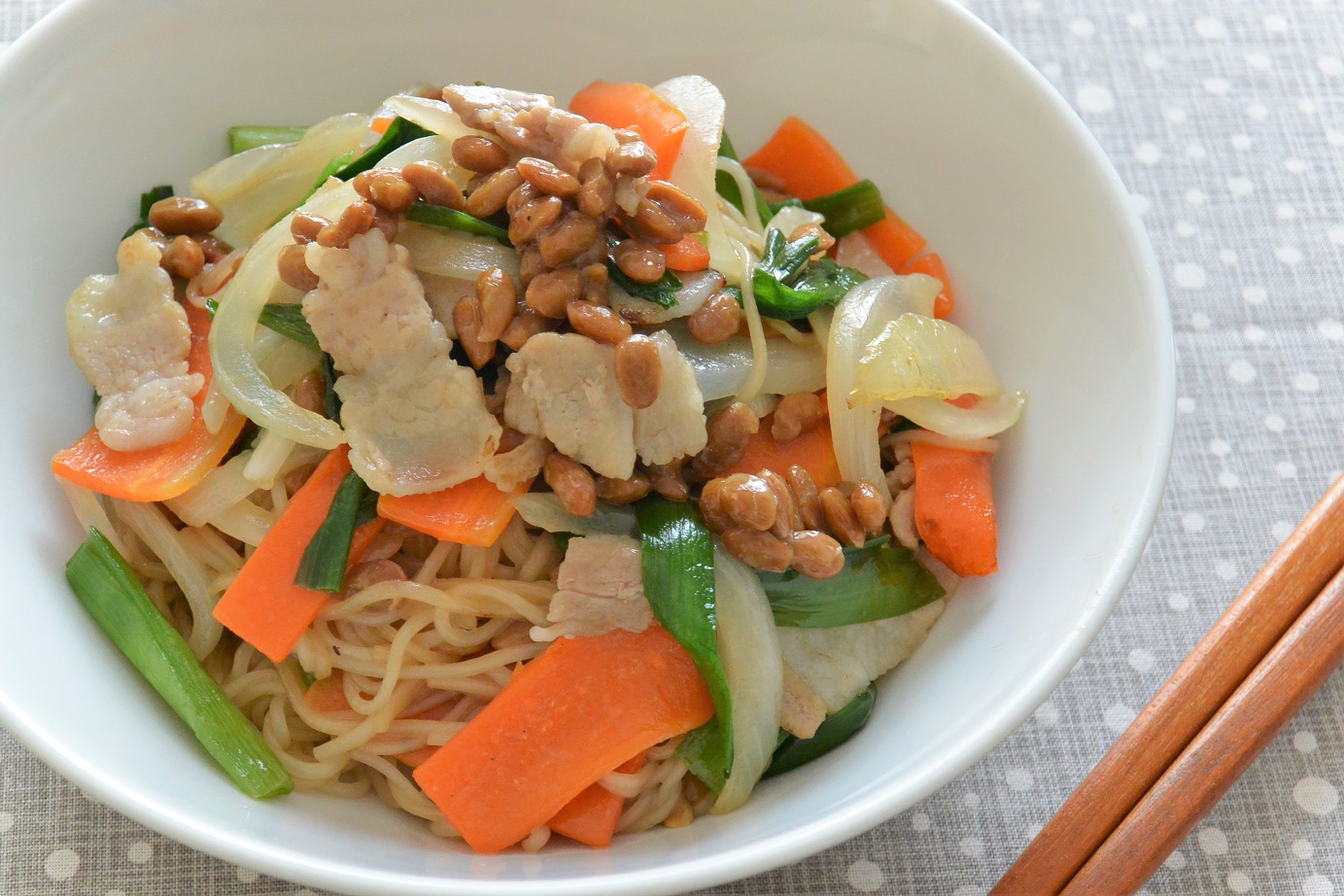 食物繊維が多い大豆を発酵させて作られる納豆は、お腹の中を健康にしてくれる便秘解消食材! たっぷりの野菜と一緒に炒めて快適な腸内環境を作りましょう!
