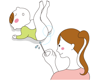 - 1. 綿棒の白い部分にベビーローション、または、ベビーオイルをたっぷりつけます。2. 赤ちゃんの肛門部に綿棒の白い部分を入れます。3. 綿棒をゆっくり回します。
