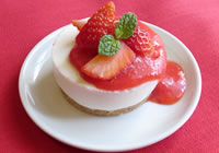 9.いちごを飾り用に2個残し、ミキサーにかける。もしくはスプーンの背でつぶす。ケーキが固まったら型から外し、いちごのソースをかけ、飾り用のいちごを載せれば出来上がり!