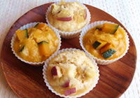4.生地をカップに入れ、飾り用に残しておいたかぼちゃ、さつまいもをのせる。