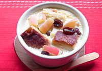 5.ココットに1.のりんご、パンとレーズンを入れる。4.を流し入れ、蒸し器で5分ほど蒸す。