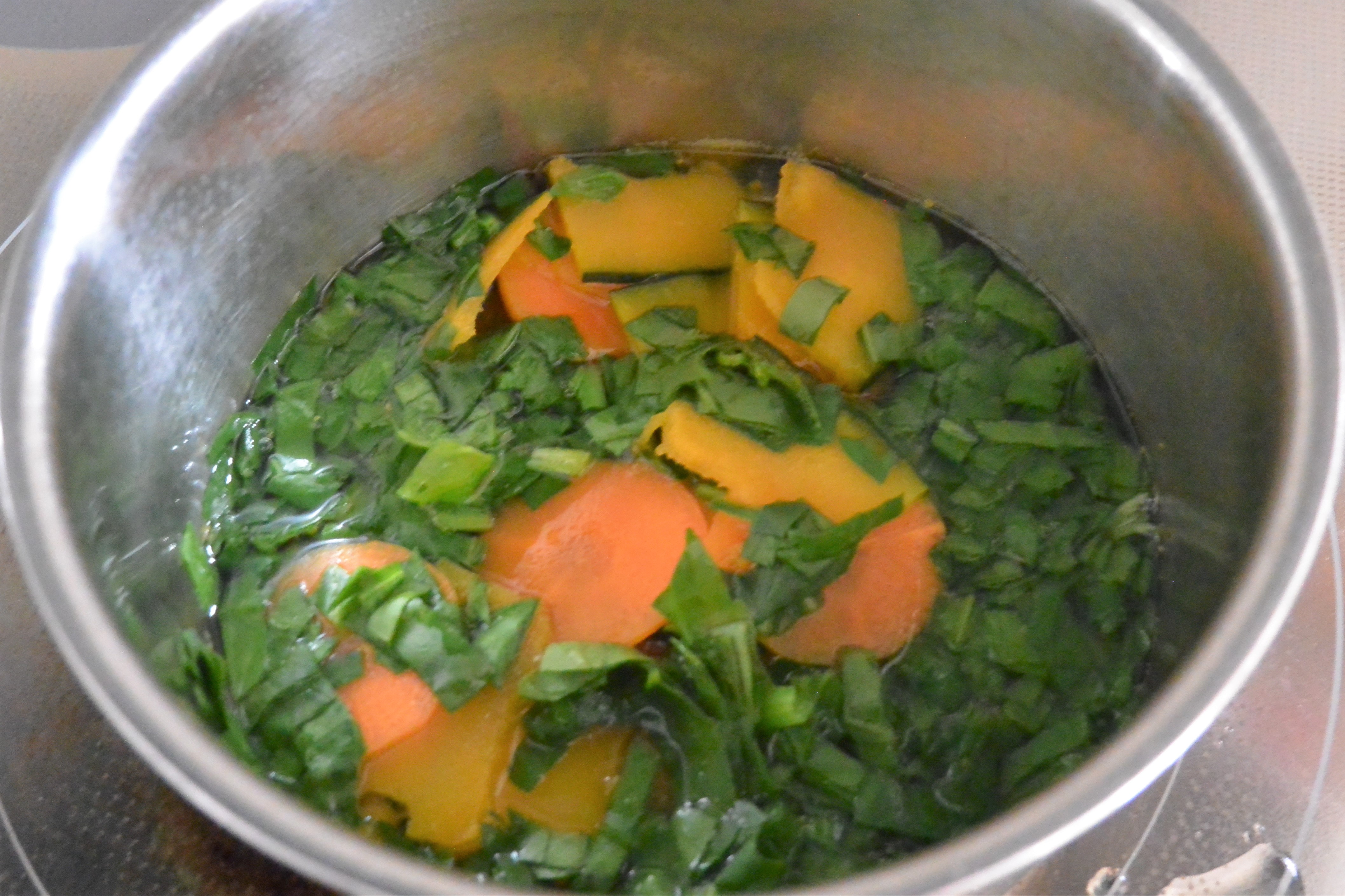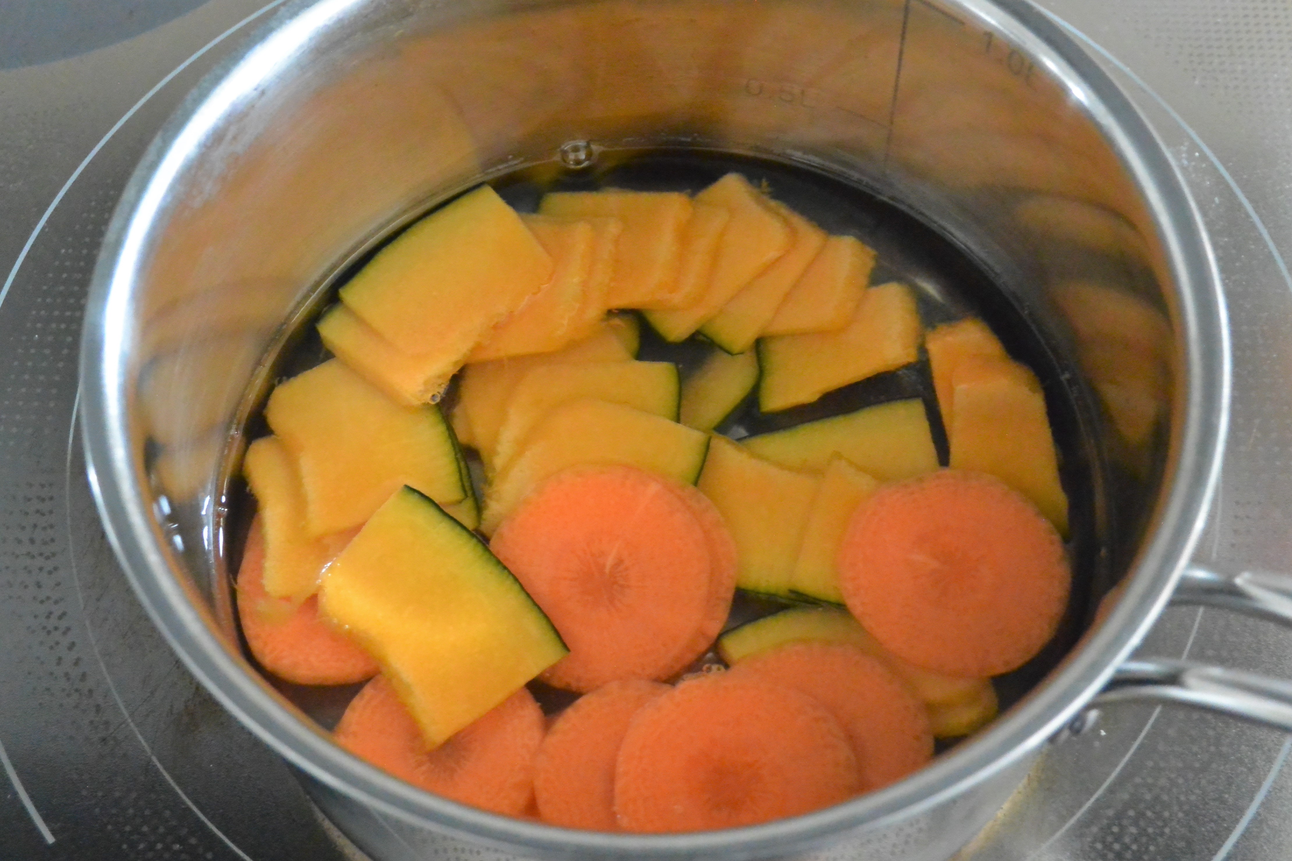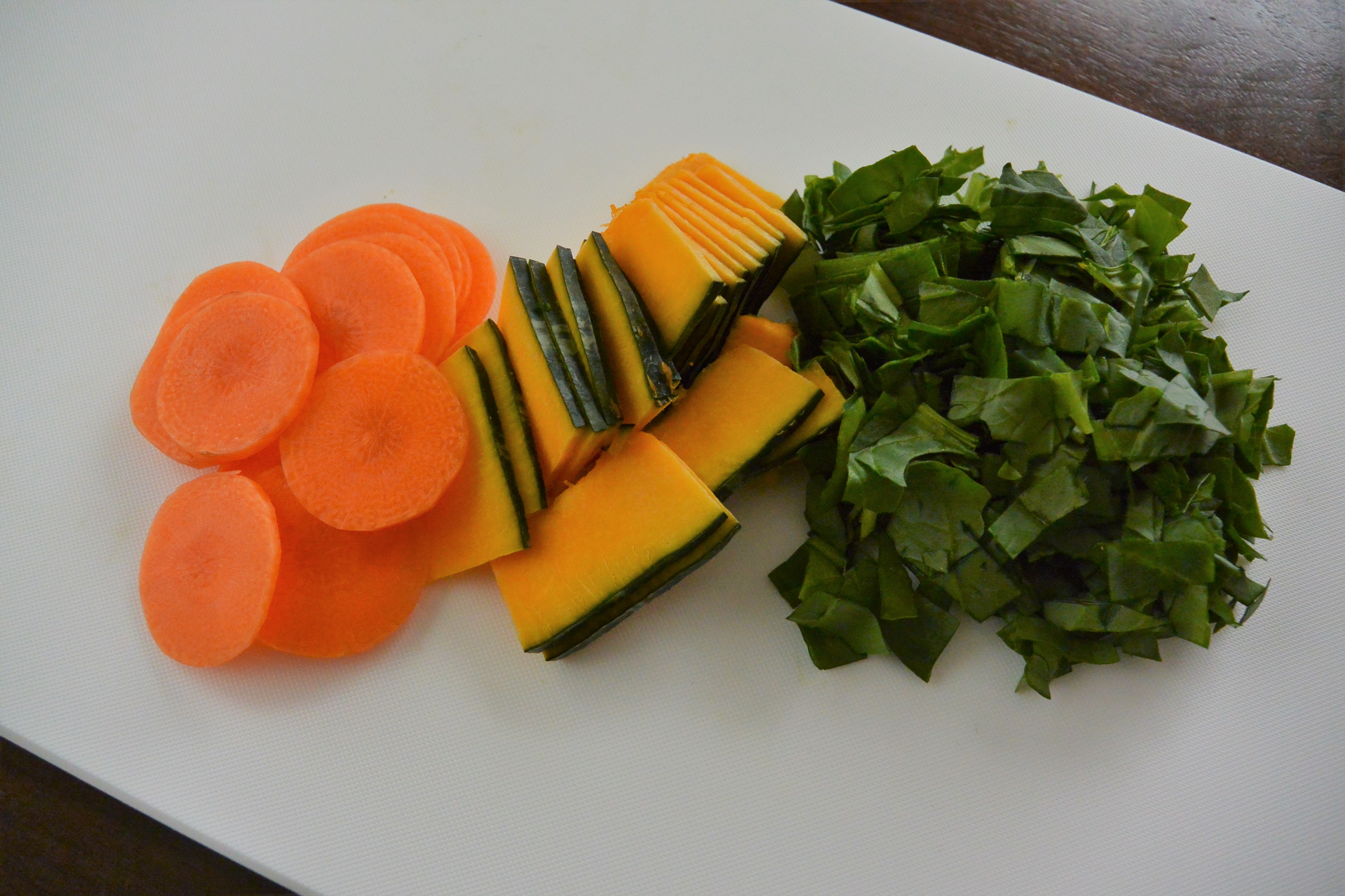 2.鍋に、かぼちゃとにんじんを入れ、ひたひたの水を加えてやわらかくなるまでゆで、最後にほうれんそうを加えてしんなりしたら水気をきり、耐熱容器に入れる。