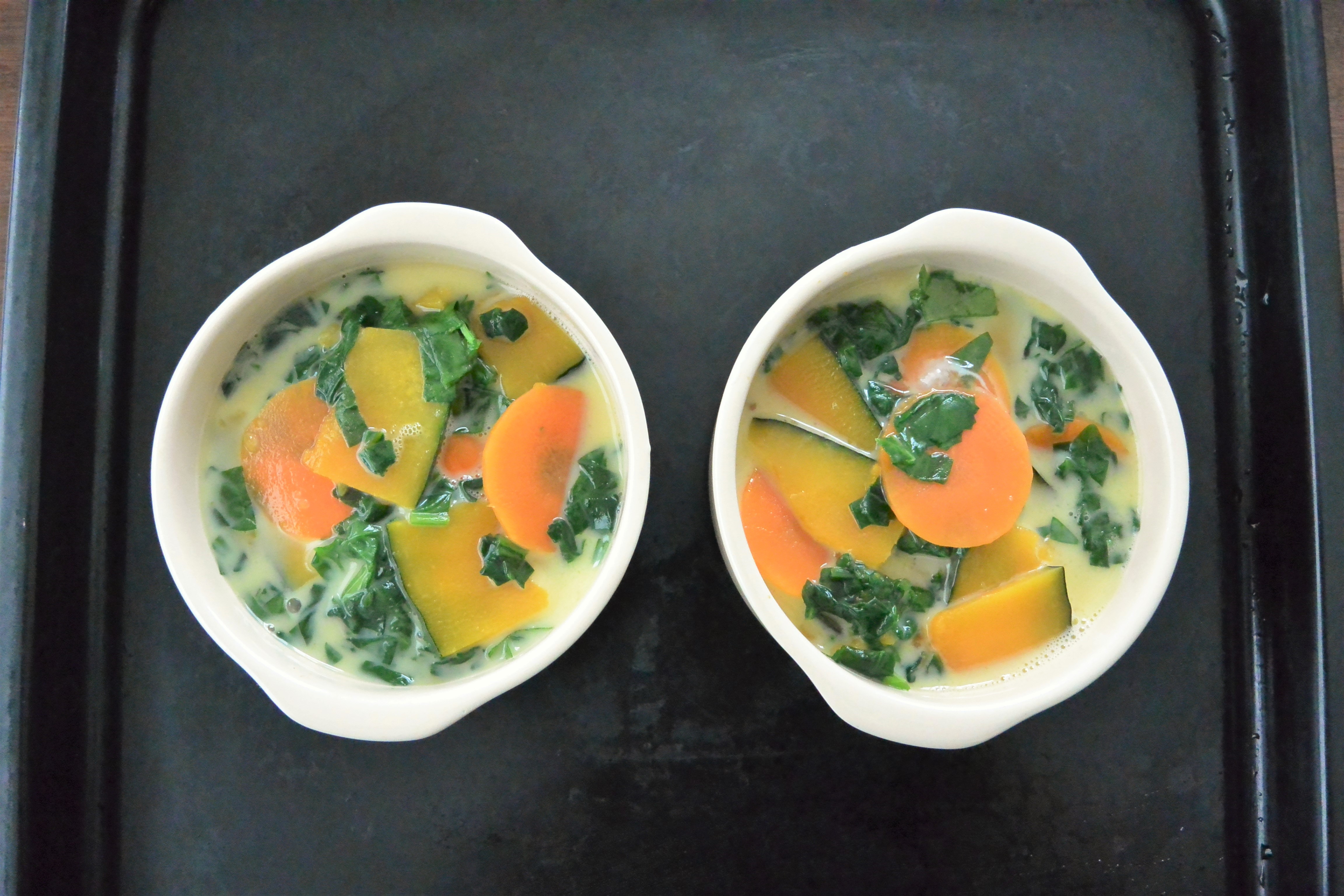 1.かぼちゃ、にんじんは薄切りにする。ほうれんそうは粗くきざむ。ボウルに卵と牛乳を入れて混ぜる。