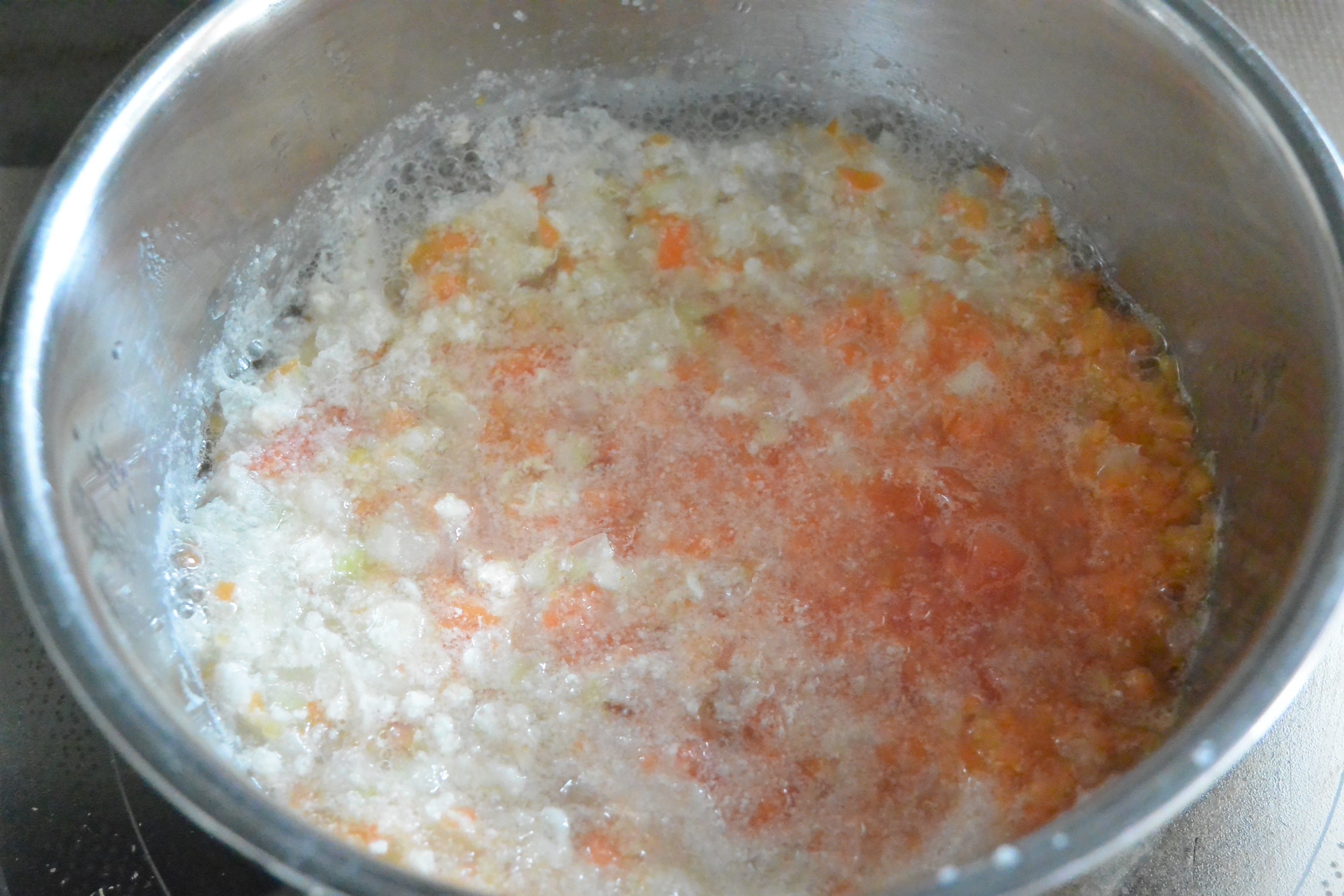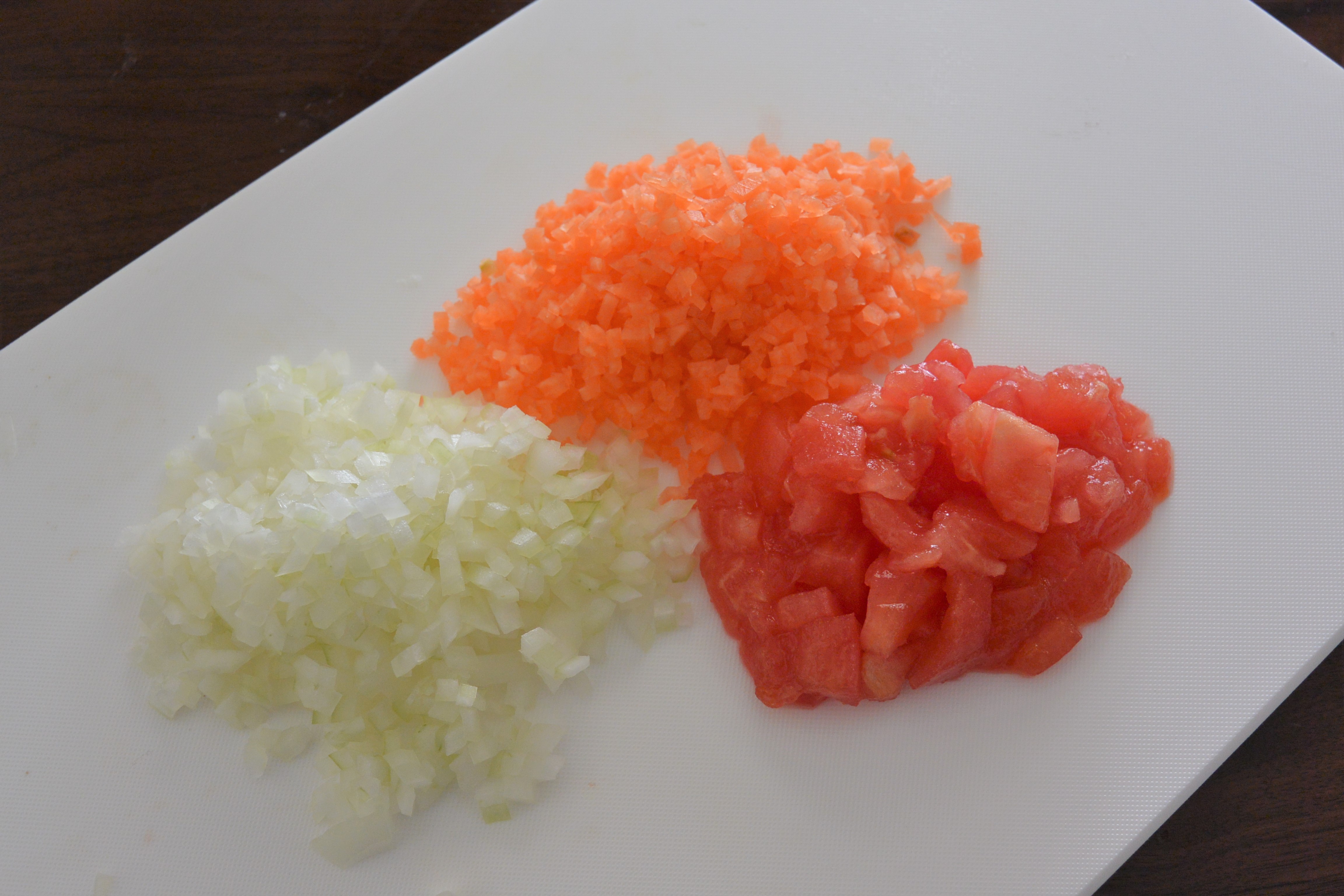 1.たまねぎ、にんじんは、みじん切りにする。トマトは皮と種を除いて粗く刻む。大さじ1の水と片栗粉を混ぜておく。