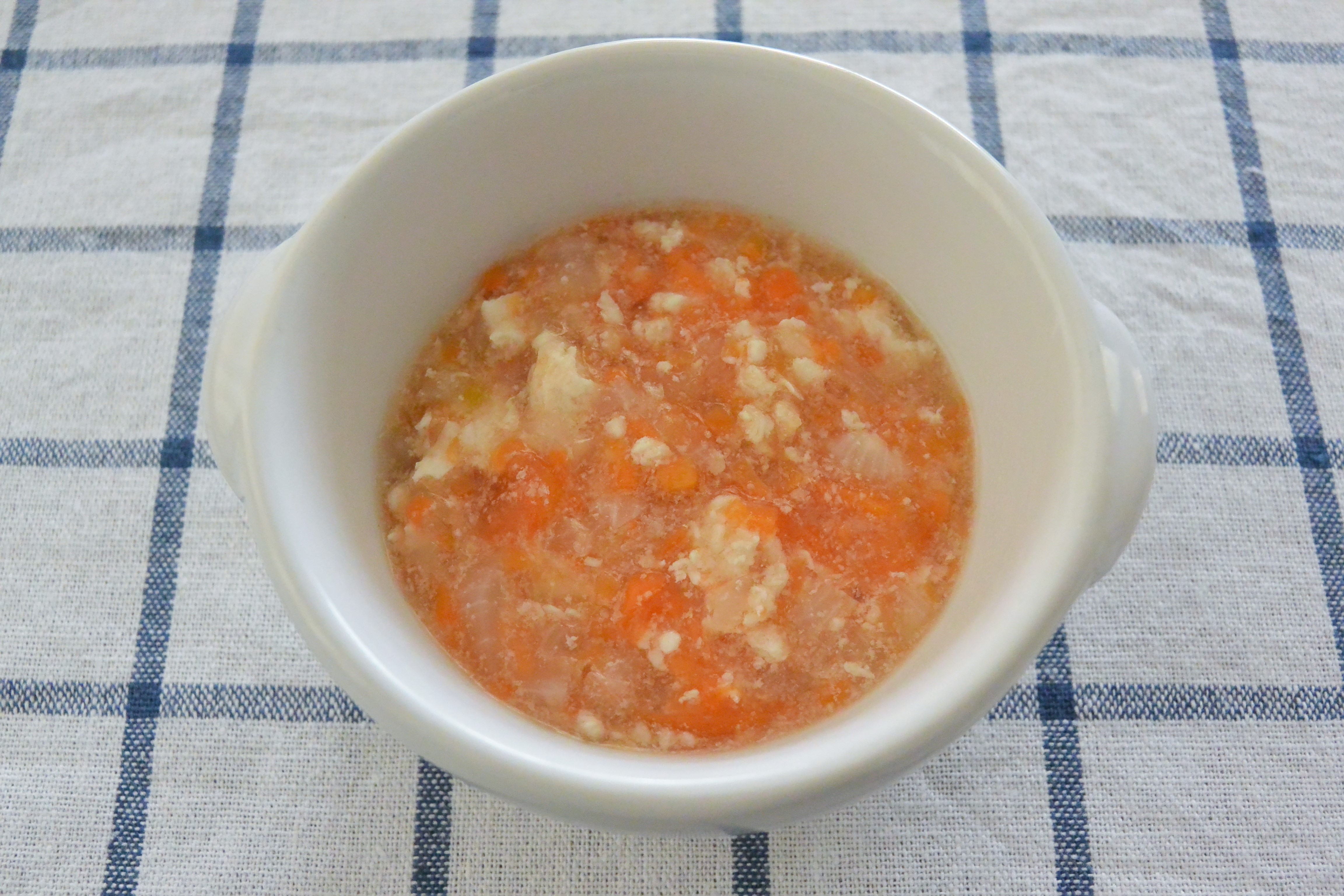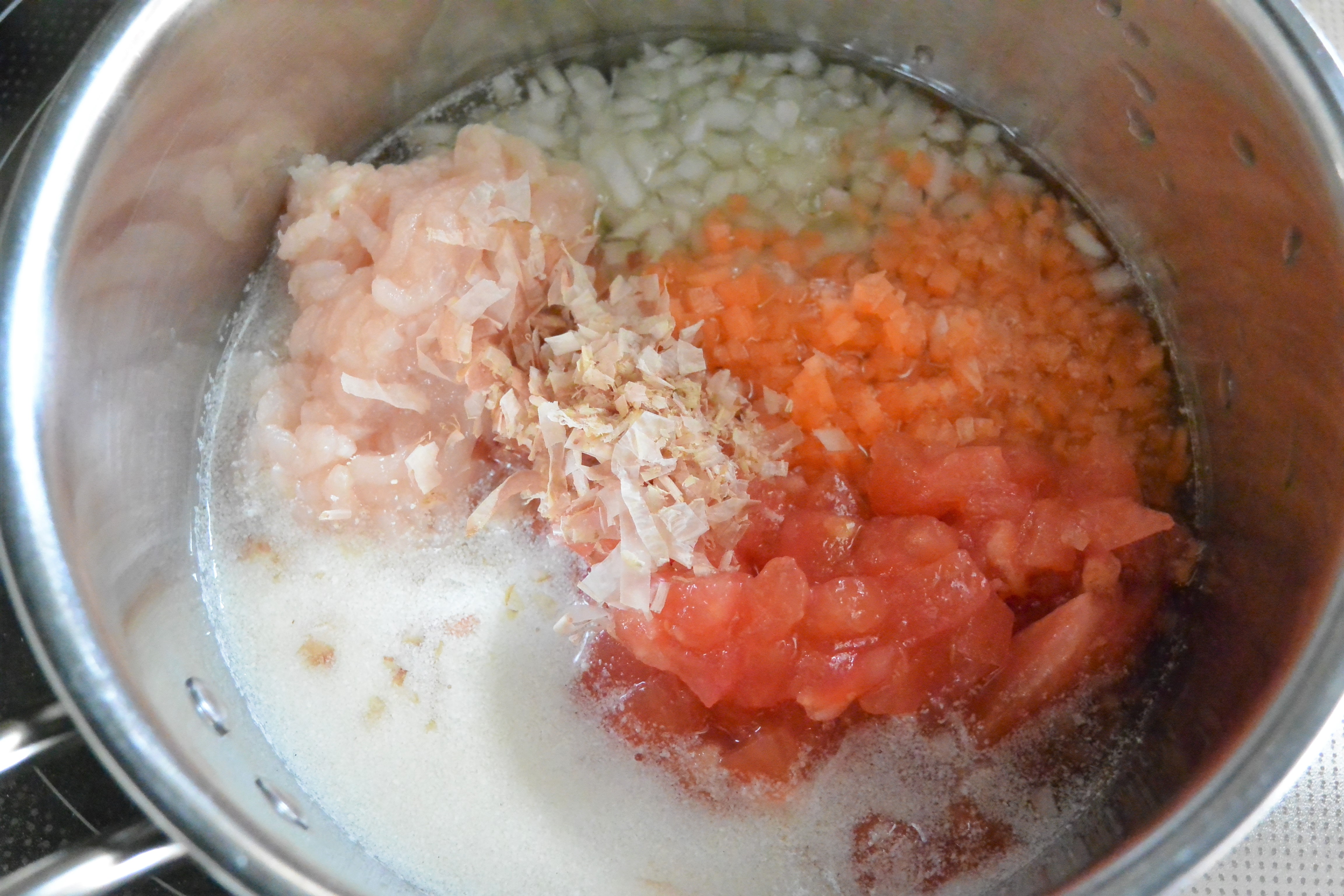 2.鍋に、鶏ひき肉、たまねぎ、にんじん、トマト、おからパウダー、かつお節を入れて中火にかけ、煮立ったら弱火にして15分ほど煮る。