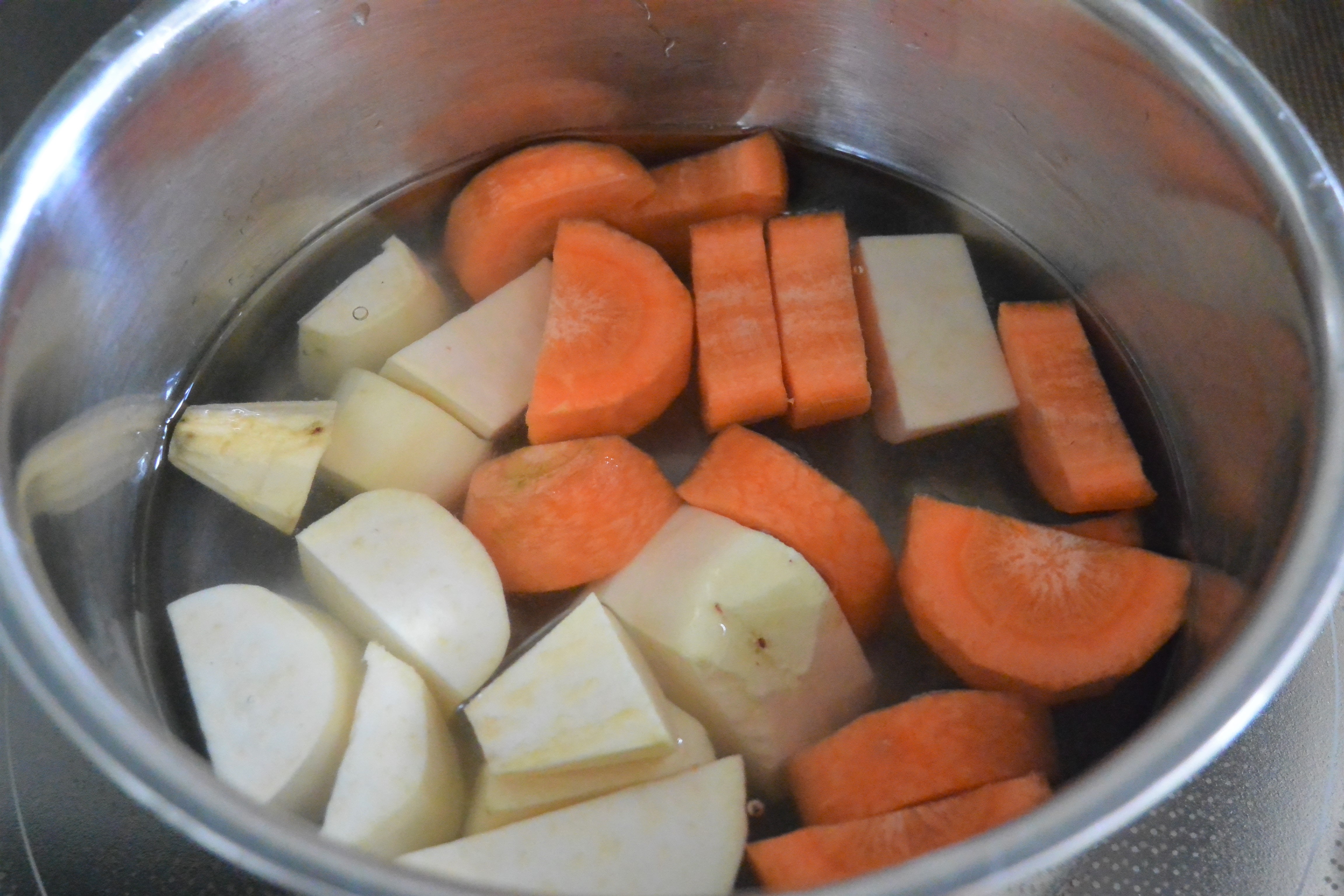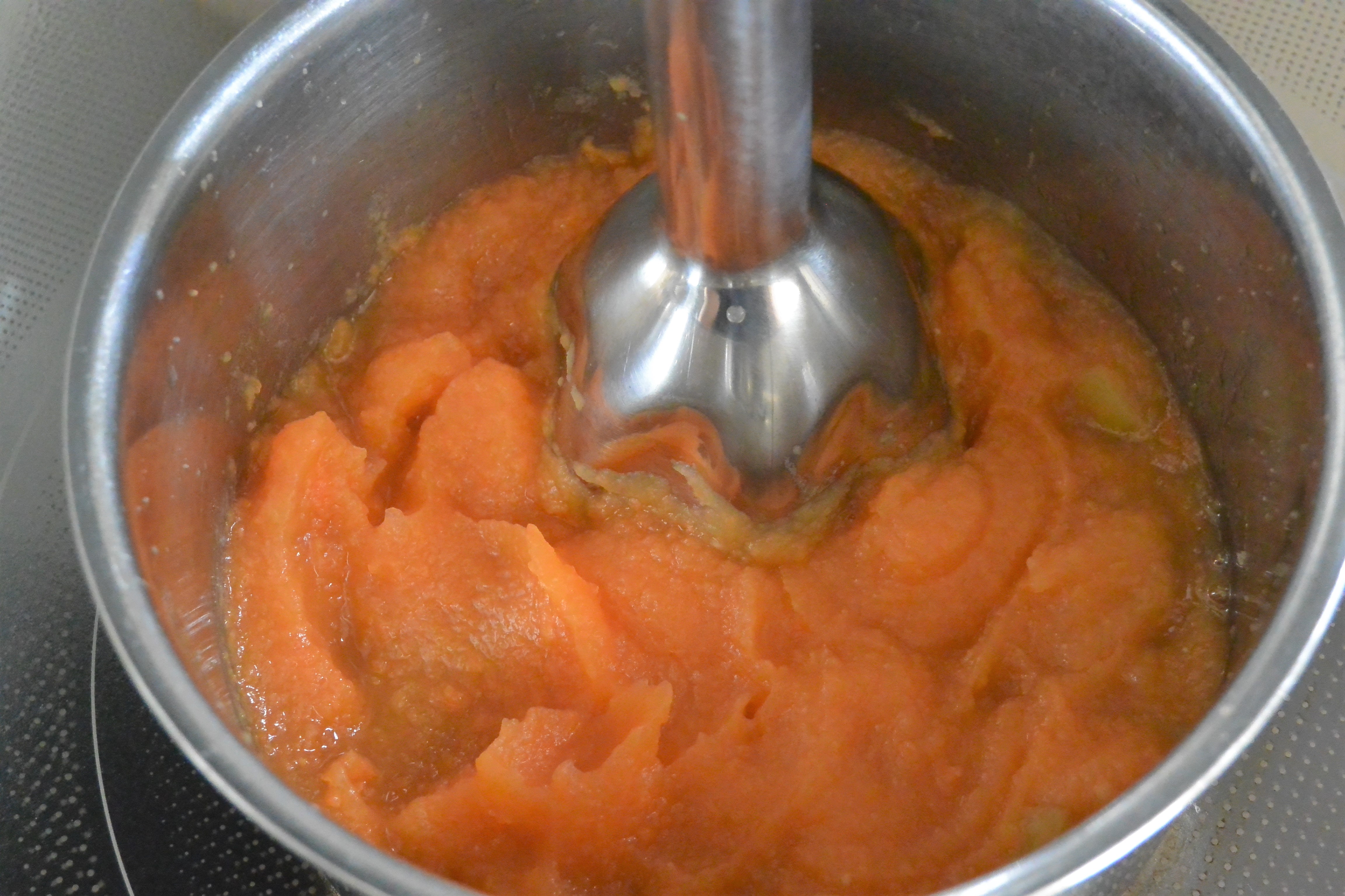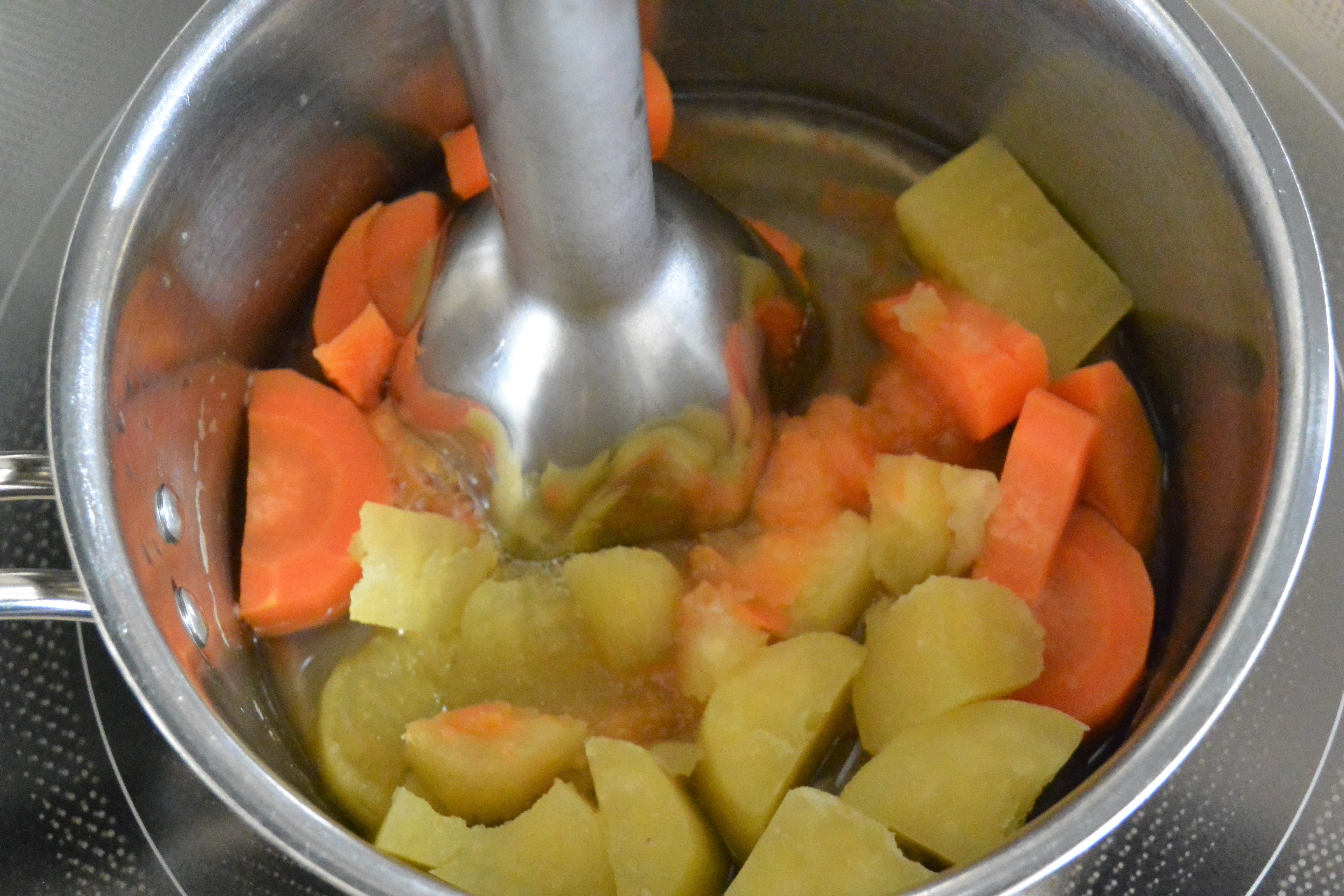 今月の便秘解消離乳食は「さつまいもとにんじんのポタージュ」。さつまいももにんじんも、ゆっくり煮てやわらかくすると甘みたっぷり。多めに作って冷凍しておくと便利です。