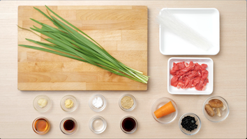 - にらは4㎝幅に、にんじんは千切りにする。しいたけは薄切りにする。乾燥わかめは水戻しし水気を絞る。Aの調味料は合わせておく。