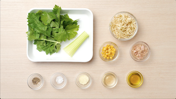 - セロリの茎は筋をとり斜め薄切りにし、葉はざく切りにする。